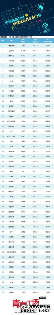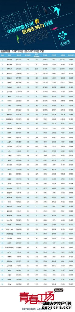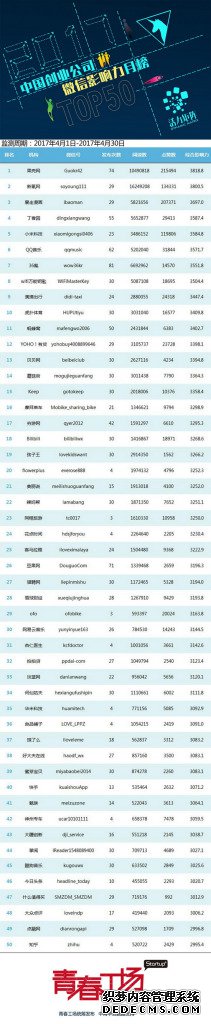 附:4月榜单综合排名TOP50及微博、微信TOP50子榜,欢迎广大创业公司关注